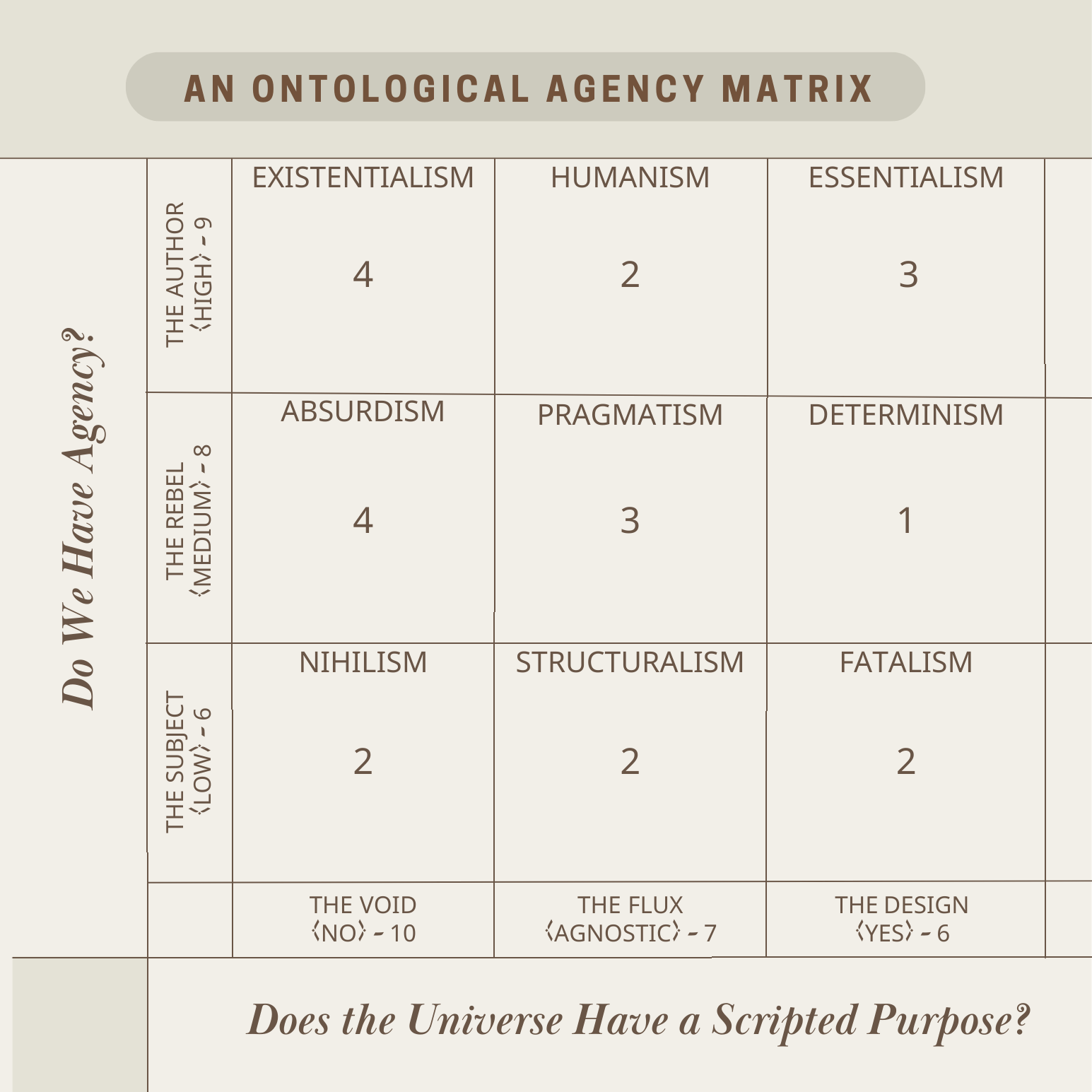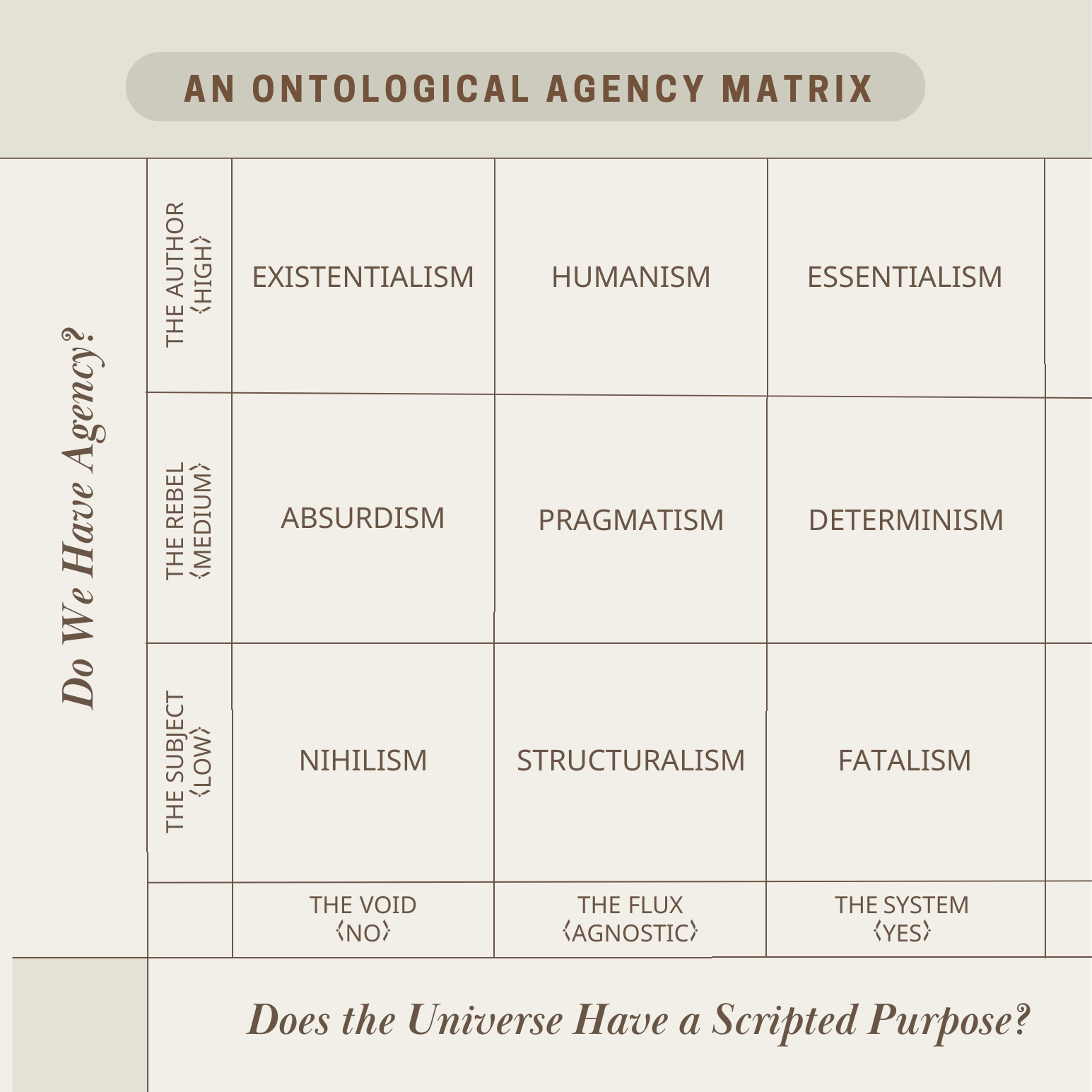 Existentialism: The individual possesses absolute agency to create their own meaning and morality within a universe that provides no inherent script or purpose.