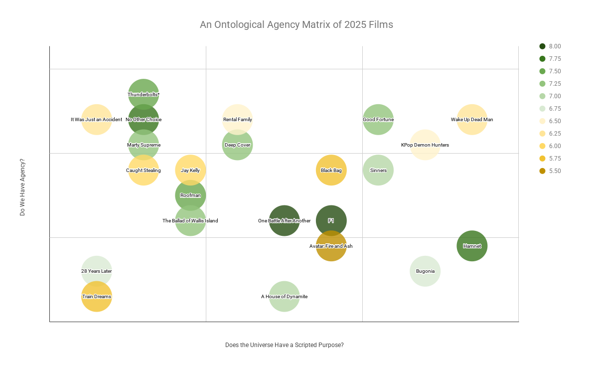 The easiest section was Nihilism in the bottom left. 28 Years Later and Train Dreams were somehow very much opposites in vibes, but shared a similar philosophy. We exist in this world, but are subject to a chaotic world, and simply just have to survive in it. We have little agency, and life flashes by.